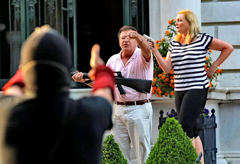 As demonstrators marched near the Renaissance palazzo-style home of Mark and Patricia McCloskey on Sunday, video posted online showed him wielding a long-barreled gun and her with a small handgun. No shots were fired.